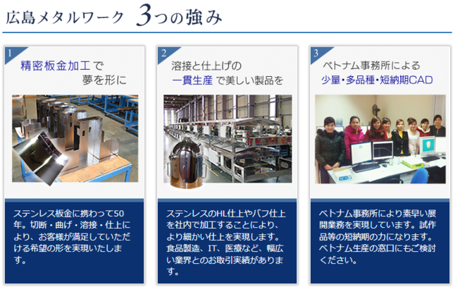 ステンレス鈑金に携わって50年。ステンレススチールという魅力ある金属に切 断・曲げ・溶接・仕上げといった高度な加工技術を加えることで、お客様が必要とする製品を作り出しています。早くから自社ベトナム事務所でのCADデータ作成に特化することで短納期のCAD図面製作を実現し、熟練工の技術力と最新設備の融合により食品製造業者を始め、半導体製造業者、医療用設備製造業者 など幅広い業界へ迅速かつ高精度、高品質な製品を提供しています。