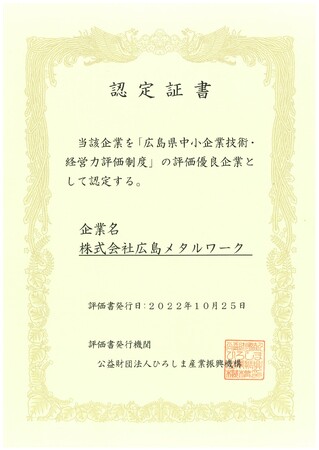 金属製品製造・加工を行う株式会社広島メタルワーク(本社:広島県、代表者:前田 啓太郎)は、公益財団法人ひろしま産業振興機構が運営する中小企業技術・経営力評価制度において、「評価優良企業」に認定されたことをお知らせします。
