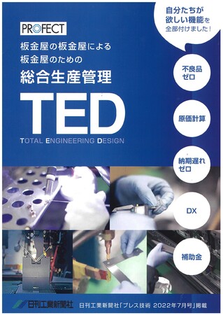 東北地区・関東地区・関西地区・中国地区・九州地区に拠点を構える製造業者の経営者とともに「プロフェクト株式会社」を運営。生産管理の強化に向けた技術・経営情報の交換や共同研究、技術勉強会等を定期的に開催。生産管理ソフト『TED』を開発・販売し、好評を得ている。当社についても、『TED』を活用し、製造過程の進捗状況・ 出荷状況の把握、品質の管理を行ってる。また、加工データを蓄積することで再受注時の時間短縮とさら なる技術力向上を目指し、日々専門技術を磨き業務効率化を図っています。