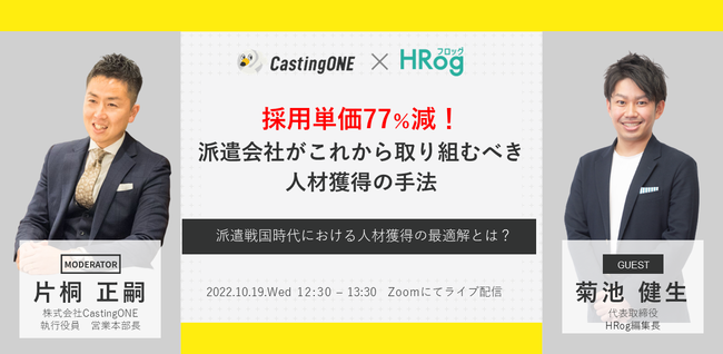 株式会社CastingONE(キャスティングワン、本社:東京都渋谷区、代表取締役:野澤 怜司)は、株式会社フロッグ(東京都千代田区、代表取締役:菊池 健生)と共同で「【採用単価77%減】派遣会社がこれから取り組むべき人材獲得の手法ウェビナー」を開催致します。