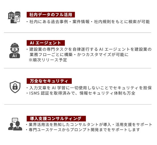 - 導入・運用を徹底サポートする万全の体制:企業の機密情報を扱う上で不可欠なセキュリティ対策を施しており、国際規格であるISMS認証(ISO 27001)も取得済みです。また、導入に際しては、建設業界の活用法を熟知した専門コンサルタントが、業務ヒアリングから効果的なユースケースの提案、さらにはプロンプト開発まで、導入後の成果創出までを一貫してサポートします。
