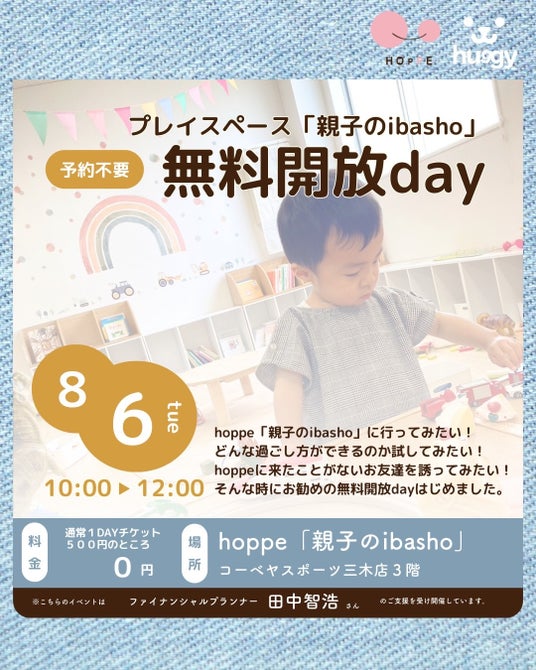 特定非営利活動法人ほっぺ(代表:大森 奈津子)は、2024年8月6日(火)、乳幼児親子のプレイスペースhoppe「親子のibasho」(コーベヤスポーツ三木本店3階)を『無料開放day』とします。hoppe「親子のibasho」に行ってみたい!どんな過ごし方ができるのか試したい!hoppeに来たことがないお友達を誘ってみたい!そんな時におすすめできるのが、無料開放dayです。