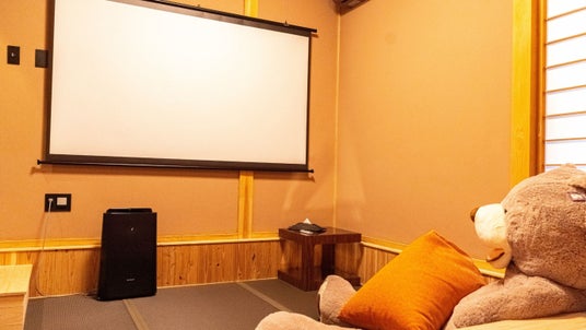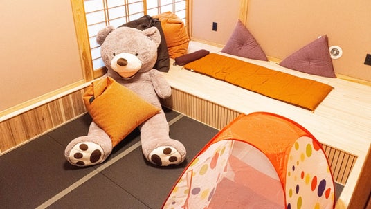 そのほか、ファミリー和洋室さくら・つばきでは、1階に小上がりを設置、大きなくまのぬいぐるみがお出迎え。YouTubeやNetflixがご視聴いただけるプロジェクターを導入するなど、お部屋の中でもお子さまと楽しんでいただける工夫を凝らしています。