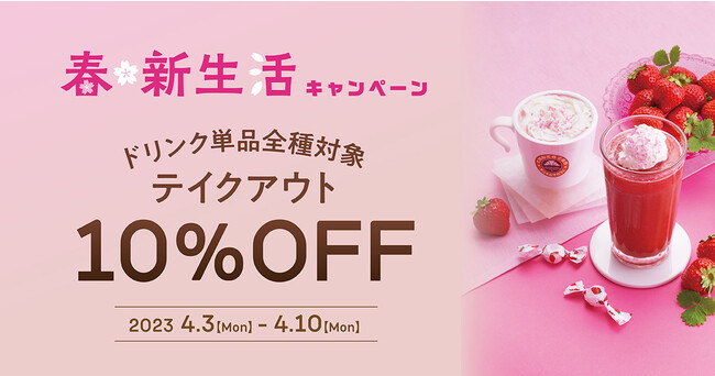 株式会社サンマルクカフェ(本社:岡山県岡山市 代表取締役社長:鎌田 滋之)は、4月3日(月)から4月10日(月)までの8日間、日頃のお客様への感謝の気持ちや、これから新生活を迎えるお客様に向けた応援の気持ちを込めて、春・新生活キャンペーン『ドリンク単品全種テイクアウト10%OFF』を実施いたします。