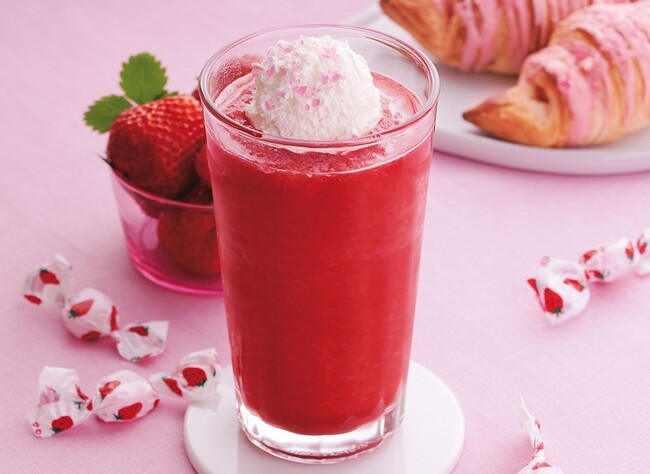 福岡県産あまおうを贅沢に使用し、果汁のうま味がたっぷりと詰まった、いちごの甘酸っぱい香りと素材本来の味わいをご堪能いただける商品です。いちごの王様とも評されるあまおうの絶妙な甘さと酸味を存分に味わえるすっきりと飲みやすいスムージーは、トッピングのミルクムースといちごみるくキャンディを混ぜ合わせることで、コク深く濃厚な味わいがプラスされ、あまおうの甘味が引き立つとともに、食感の変化も楽しめます。
