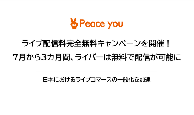 日本最大級のライブコマースアプリ「Peace You Live」(以下「ピースユーライブ」)を運営する合同会社ピースユー(本社:東京都千代田区、代表社員 職務執行者:藤瀬 公耀)は、 2023年7月~9月の3カ月間、ピースユーライブのライブ配信料を完全無料とするキャンペーンの開催をお知らせいたします。日本におけるライブコマース一般化のより一層の加速に向けて、ぜひこの機会にピースユーライブでライブコマースをお楽しみください。