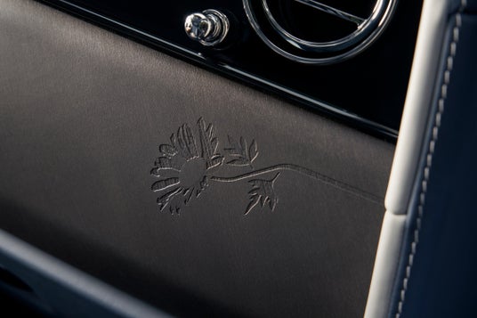 ブラックウッドのベニヤには、インテリアを彩る繊細な3色のカラーパレットが組み合わされています。メインとなるフリート・ブルー(Fleet Blue)のレザーは、ロータリー・コントロールからBピラー、Cピラーへ広がっています。これにセルビー・グレー(Selby Grey)とブラック(Black)のレザーが組み合わされ、フリート・ブルーのシート・パイピング、セルビー・グレーのコントラスト・ステッチ、そしてヘッドレストのモノグラムがアクセントを加えています。インテリアの仕上げとなるのが、デイジーのデザインをあしらったビスポークのイルミネーテッド・トレッドプレートです。