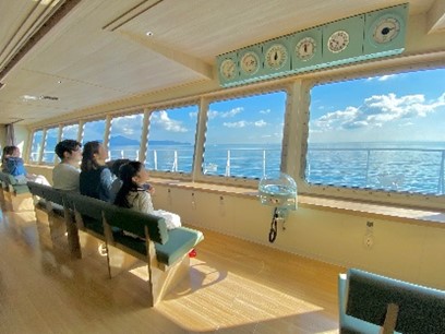 船内の隅々まで遊び心があふれており、神戸から小豆島までの約3時間の船旅が「あっという間」に感じられる、まさに「瀬戸内海に浮かぶテラスリゾート」です。