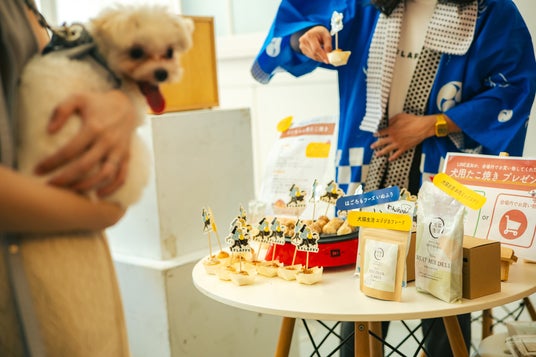 健康的で美味しいものをテーマに、犬猫生活監修のレシピで、わんちゃん用のたこ焼きをお配りしました。トッピングに、はごろもフーズのいぬふり(かつお味)を使用しました。