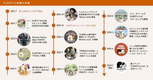 FLAFFYは、2024年7月15日にて、無事に3周年を迎えることが出来ました。創業から現在に至るまで、本当にたくさんの方々に支えられた3年間でした。創業してから、愛犬との暮らしメディア「FLAFFY.me」で築き上げたコミュニティやファンとの強い繋がりを通じてメディア発信をしてまいりました。4期目を迎えるにあたり、「イヌとヒトの関係をフラットに」という理念から「ペットとヒトの関係をフラットに」にアップデートをし、事業領域をさらに広げていきたいと考えております。まだまだ小さな会社ですが、これからも大きく前進してまいりますので、応援よろしくお願いいたします。