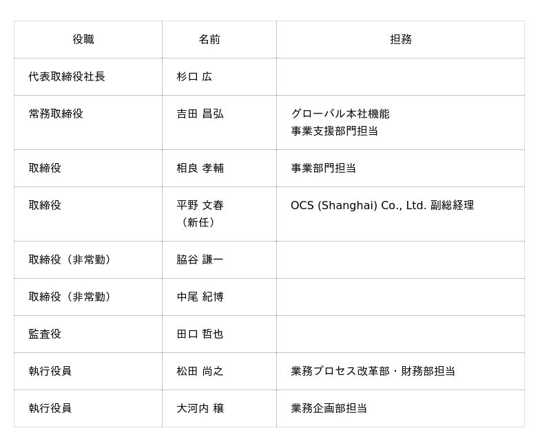 株式会社OCS(本社:東京都江東区、代表取締役社長:杉口 広、以下OCS)は、本年4月1日以降の役員体制について、以下のとおり決定いたしましたので、お知らせいたします。