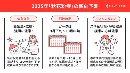 全国13院以上*の対面診療と、オンライン診療の両方を展開する「クリニックフォアグループ」(以下クリニックフォア)は、秋花粉症シーズンに先立ち、2025年の傾向予測と症状対策を発表しました。