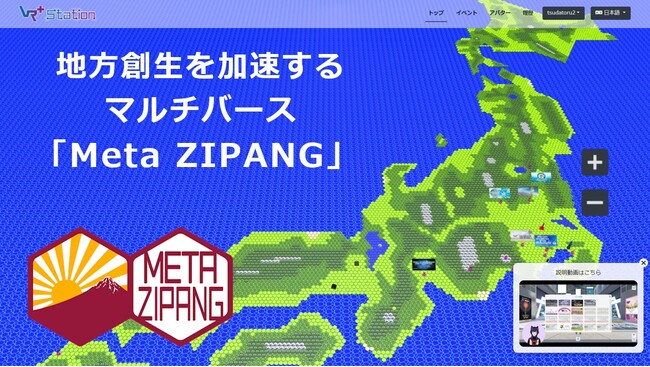 「Meta ZIPANG(メタジパング)」は、日本列島の形状を模したVma plus Stationのマルチバースの1つであり、日本各地域のテーマパークをメタバースで再現して、地場の工芸や産業、観光の情報発信の場を提供することを目的としています。現在は、地域の産業発展に貢献するために、地域住民が利用できるメタバースの設置を進めています。Meta ZIPANGに参加することはどなたでも可能なオープンメタバースです。