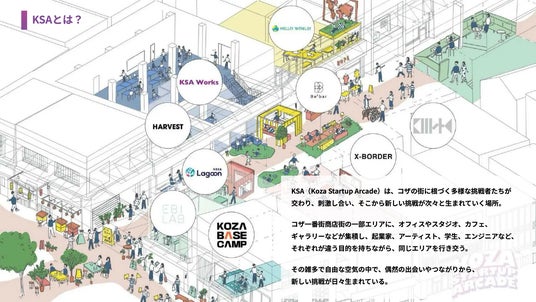 KSAは、沖縄市コザの商店街エリアに形成されたスタートアップ、クリエイター、行政、金融機関、海外事業者などが集まる挑戦者コミュニティです。