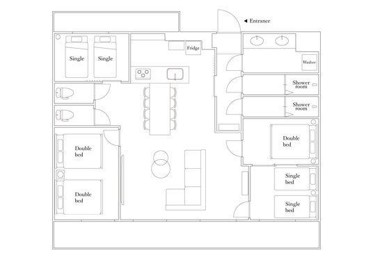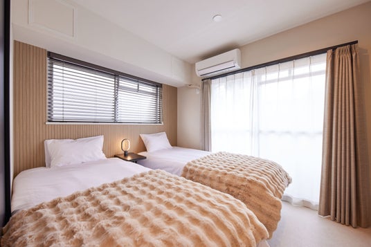 寝室は合計で4部屋あり、最大12名まで宿泊が可能です。洋室だけでなく和室も用意しているので、小さいお子様やベッドが苦手な方も安心です。(洋室1:ダブルベッド1台/洋室2:シングルベッド2台/洋室3:ダブルベッド2台/和室:布団2組/リビング:ダブルサイズソファベッド1台)