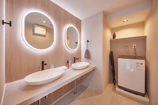 洗面化粧室はダブルボウル仕様に。大人数での宿泊に対応できるよう、ミラー、ドライヤーもそれぞれ2つずつ設置しました。照明付きミラーは化粧のしやすさだけではなく洗面室全体の雰囲気を整えてくれます。また、洗濯機やアイロンも備えているので長期滞在でも安心です。