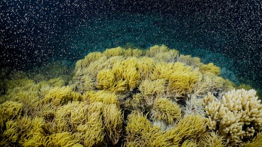 サンゴは年に1度、卵子と精子の塊(バンドル)を海中に放出し、海面に向かって上昇しながら受精が行われます。この様子は「海中の吹雪」と呼ばれ、産卵自体は数時間から数日間に及ぶこともあります。産卵は卵子が海中の安全な場所に着床する時間を少しでも長く確保できるように日没から深夜にかけて、プランクトンを食べる生物が眠っている時間帯に行われる可能性が高いと言われています。成功すれば受精卵は海底に沈み、やがてサンゴに成長します。