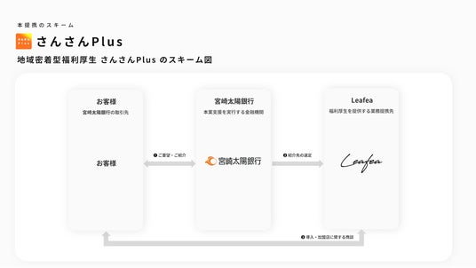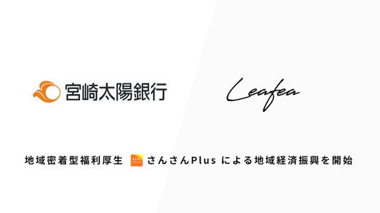 地域密着型福利厚生サービスを提供する株式会社Leafea(本社:東京都中央区、代表取締役:森田 渉、以下リーフィ)は、株式会社宮崎太陽銀行(本店:宮崎県宮崎市、取締役頭取:黒木 浩、以下宮崎太陽銀行)と提携を開始します。1/27(火)より宮崎太陽銀行で地域密着型福利厚生サービス「さんさんPlus」の取扱いを開始し、地域創生と日々頑張る方の支援を目指します。