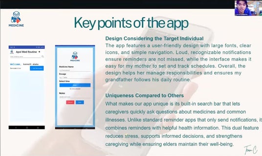 「祖父の薬管理に苦労する母を助けたい」という想いから開発。データベースとアラーム機能を活用し、服薬時間を記録・通知することで、家族間のケアの負担をテクノロジーで軽減します。