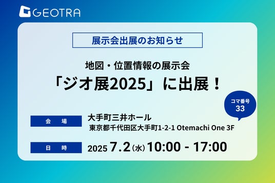株式会社GEOTRA(本社:東京都千代田区、代表取締役社長:陣内 寛大、以下GEOTRA)は、2025年7月2日(水)に開催される、地図・位置情報関連の企業やサービスが一堂に会する共同展示会「ジオ展2025」に出展いたします。