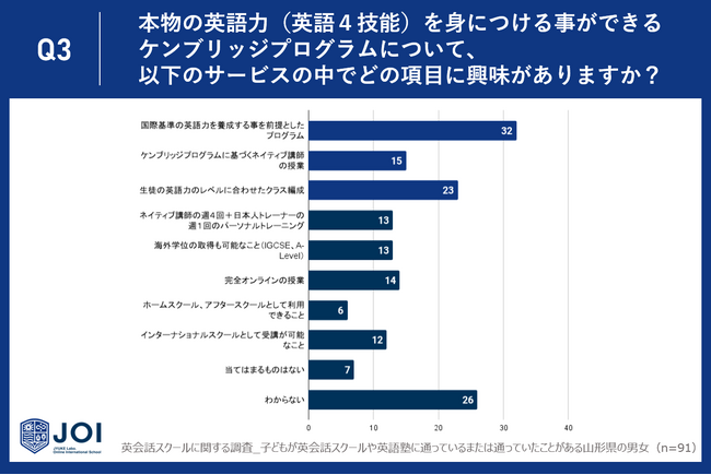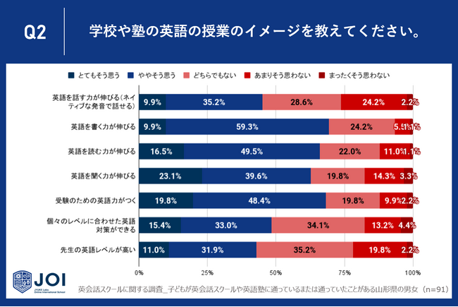 じゅけラボOnlineインターナショナルスクールJOIは、子どもが英会話スクールや英語塾に通っているまたは通っていたことがある山形県の男女91人に、英会話スクールや英語塾の効果に関するアンケート調査を実施しました。