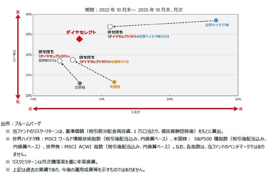 当ファンドと、世界株、米国株、世界ハイテク株との併せ持ちによるリスク・リターンを見ると、各資産を単体で保有するよりもリスク・リターンが改善傾向にありました。海外株式偏重のポートフォリオの改善にお役立ていただいています。