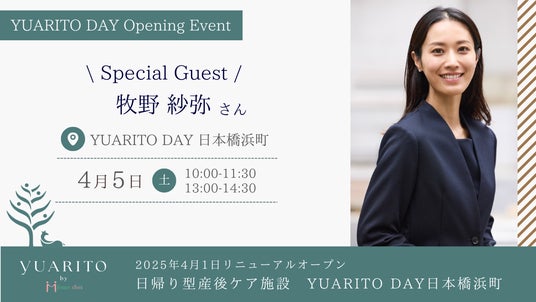 株式会社Josan-she's(本社所在地: 東京都中央区、代表取締役CEO: 渡邊愛子、以下ジョサンシーズ)は、4月5日(土)に開催する日帰り型産後ケア施設「YUARITO DAY 日本橋浜町」オープニングイベントのスペシャルゲストに、モデル/実業家/ブランドディレクターの牧野 紗弥さんの登壇が決定しました。