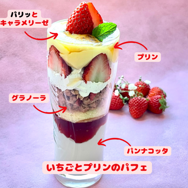 キャラメリーゼしたプリン、ホイップクリーム、グラノーラ、いちごソース、スポンジケーキ、パンナコッタの6層仕上げ。