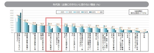 また、「同行者がいると気疲れする」「慣れない場所でのストレスは避けたい」などの理由では、若年ほど高い傾向。