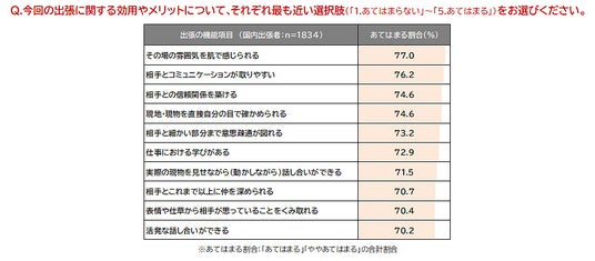 3. 出張における効用・メリットに関して、最も「あてはまる」の回答が多い項目は「その場の雰囲気を肌で感じられる」で77.0%。次いで「相手とコミュニケーションが取りやすい(76.2%)」、「相手との信頼関係を築ける(74.6%)」が続く。図表は31ある出張機能の上位10項目。