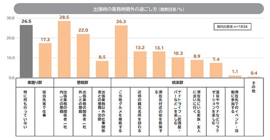 7. 出張業務外の過ごし方の実態を見た。「出張業務の関係者(社内)との懇親」が28.5%で最も多く、次いで「特に何も行っていない」が続く(26.5%)。