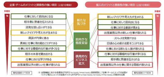 4. 出張の効用・メリットと「企業・チーム/個人にとっての出張メリット」の関係性を分析した。双方のメリットに対する影響度が高いものは、共通して、 新たな気づきを得る機能【新たな気づき】、仕事への態度を前向きに変容する機能【前向きな態度変容】、偶発的にビジネスを拡大させる機能【偶発的なビジネス拡大】であった。