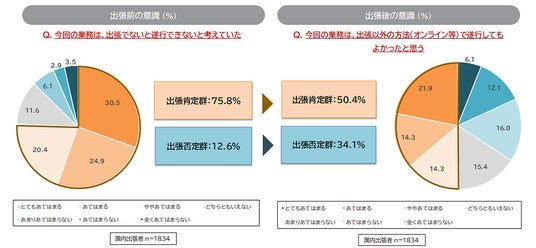 1. 出張前に出張を前向きにとらえている層は75.8%。一方、出張を終えた後に、出張を前向きにとらえている層は50.4%に低下。