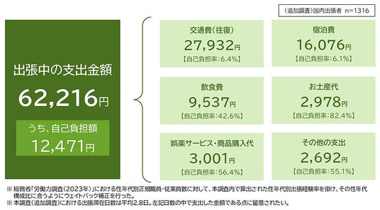 9. 出張に関する支出金額は、交通費や飲食・宿泊費、娯楽サービスなども含めた合計で62,216円。その内、自己負担の支出額は12,471円。(交通費を除き、地域での消費額は34,284円)