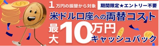 4年に一度の米国大統領選挙の機会に合わせて、顧客の米国株投資をサポートするため、キャンペーン期間中に日本円口座から米ドル口座に1万円以上*4の資金振替を行った場合、発生する両替コスト0.25%(最大10万円)*5をキャッシュバックします。