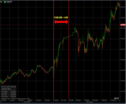 以下の10月28日午前3時~5時のドル円のチャートは、今回の衆議院選挙の結果発表時において、速やかに市場へ参入できる環境が、市場機会を捉える上で極めて重要であることを示しています。