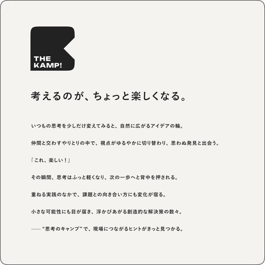 本プログラムが目指すのは、単なる知識の習得だけではありません。いつもの思考を少しだけ変えてみることで広がるアイデアの輪や、仲間と交わすやりとりの中で視点がゆるやかに切り替わり、思わぬ発見と出会う瞬間を大切にしています。 「これ、楽しい!」と感じることで思考はふっと軽くなり、次の一歩へと背中を押されます。そこでの実践は、課題との向き合い方にも変化をもたらし、小さな可能性にも目が届き、創造的な解決策が浮かび上がる。そんな「思考のキャンプ」で、現場につながるヒントを見つけ出します。