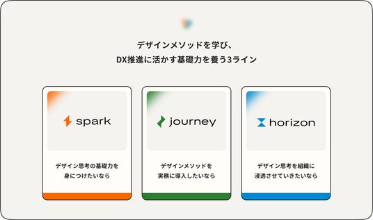 - spark(スパーク):デザイン思考の基礎力を身につけたいなら初心者、DX推進の初動メンバー向け。デザイン思考入門、マインドセット醸成、チームビルディングなど、プロジェクト導入の第一歩として思考の柔軟性を養います。