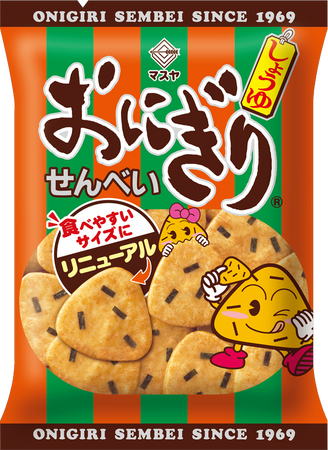 1969年に誕生したおにぎりの形の三角形をかたどった、ソフトな食感のおせんべいです。ふっくらサクサクのお米の生地に「だし」のうまみにこだわった甘辛のしょうゆタレで味付けし、風味豊かな焼き海苔が振りかけられております。また、昨年発売10周年を迎えた『おにぎりせんべい 銀しゃり』は大きさの異なるつぶ塩がお米の旨味を引き立てる味わいでこちらも大人気商品です。