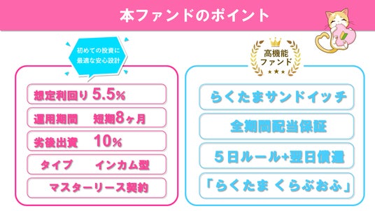 本ファンドへの投資額は「らくたま くらぶおふ」(シーズン2=2025年3月1日から3ヶ月)の参加基準となる2月15日時点の運用金額に合算されます。魅力的な特典が満載の「らくたま くらぶおふ」にぜひご参加ください。詳細はこちらのPDF資料「らくたまWORLD(新しい冒険をはじめよう!)」をご確認ください。