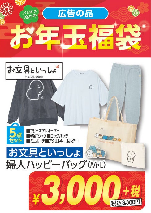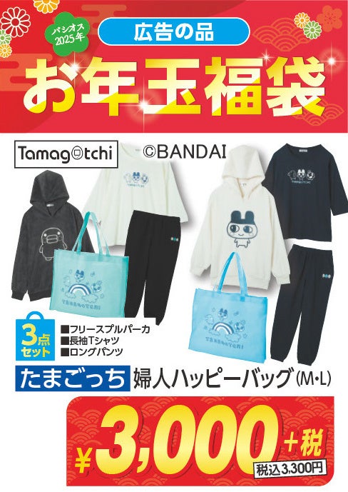 レディースの福袋では、人気の「お文具といっしょ」5点セット税込3,300円や、「たまごっち」3点セット税込3,300円の福袋が登場!