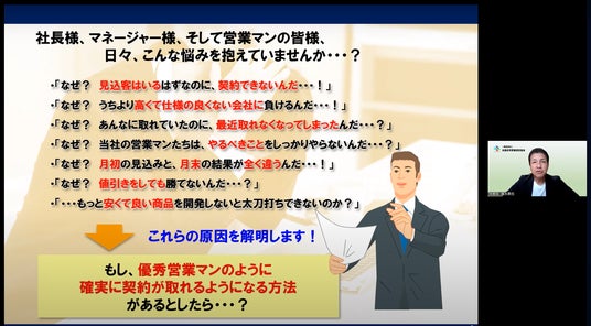 そして、去る6月27日(木)、住宅営業マン研修「住宅営業マンが確実に月1棟以上の契約を上げるための『8×4=32の法則』」をオンラインで開催。住宅営業に特化した資格制度を立ち上げた、一般社団法人全国住宅営業認定協会(本部:東京都千代田区)の代表理事であり建設業界専門コンサルティング会社の株式会社シンクパス(本社:神奈川県鎌倉市)の瀧本真也代表取締役が、優秀な営業マンが必ずやっていることを具体的に解説し、会員や会員の紹介企業から100名以上に参加いただきました。