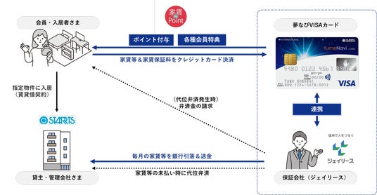 ジェイリース株式会社(本社:東京都新宿区・大分県大分市、東証プライム市場:7187、以下ジェイリース)は、スターツコーポレーション株式会社(東証プライム市場:8850 本社:東京都中央区、以下スターツコーポレーション)が提供するクレジットカード「夢なびVISAカード」のポイントサービス「家賃deポイント」と、ジェイリースの家賃債務保証サービスとの連携を2025年4月より開始することをお知らせいたします。