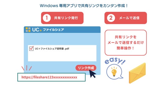 Webブラウザ上のUC+ファイルシェアへのアクセス無しに、直接Windows 専用アプリを通じてファイルの共有リンク作成が可能です。