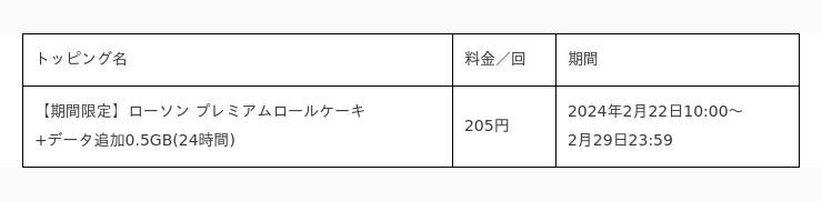 KDDI、沖縄セルラーは2024年2月22日から2月29日まで、povo2.0において、ローソンの「プレミアムロールケーキ」とpovo2.0の「0.5GB(24時間)」がセットになったトッピングを提供します。