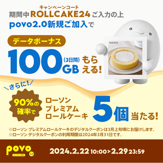 また、2024年2月29日までのpovo2.0新規加入で、100GB(3日間)が必ずもらえるほか、抽選で90%の確率(注)で「プレミアムロールケーキ」5個分があたるキャンペーンを開催します。