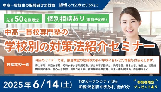 株式会社メイツ(本社:東京都新宿区 代表取締役:遠藤尚範)が運営する『中高一貫校専門 個別指導塾WAYS(以下、WAYS)』では2025年6月14日(土)に渋谷にて、中高一貫校に通う生徒・保護者さまを対象とした、学校別の対策法紹介セミナーを開催いたします。