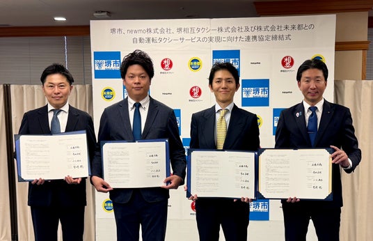 newmo株式会社(代表取締役社長:青柳直樹)、堺相互タクシー株式会社(代表取締役社長:小山泰生)、株式会社未来都(代表取締役副社長:宮崎聡)の3社は、堺市(市長:永藤英機)と、自動運転タクシーサービスの実現に向けた連携協定を締結しました。本協定に基づき、堺市内での自動運転タクシーの実装に向け、実証実験、関係機関との体制構築、実証走行エリアの調整・確保等を共同で推進していきます。