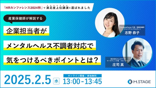 株式会社エムステージ(本社:東京都品川区、代表取締役:杉田雄二)の産業保健事業部は、2/5(水) 13時より、メンタルヘルス不調者が発生した際の業務について、産業保健師の観点から、事例を用いて気を付けるべきポイントを解説するウェビナーを開催いたします。