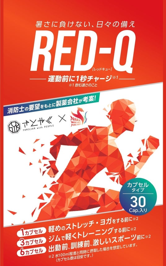 協定の第1弾として共同開発した「RED-Q」は、暑さ対策のための塩分補給ができるカプセルタイプのサプリメントです。本サプリメントは、出動前や訓練前に素早く塩分補給ができ、口の中に後味が残らないものが欲しいという消防士の要望をもとに開発しました。この度、暑さの中で活動する消防士と同様に、夏にスポーツを楽しむ方の運動前の塩分補給として「RED-Q」を提案するべく、新キービジュアルを制作しました。